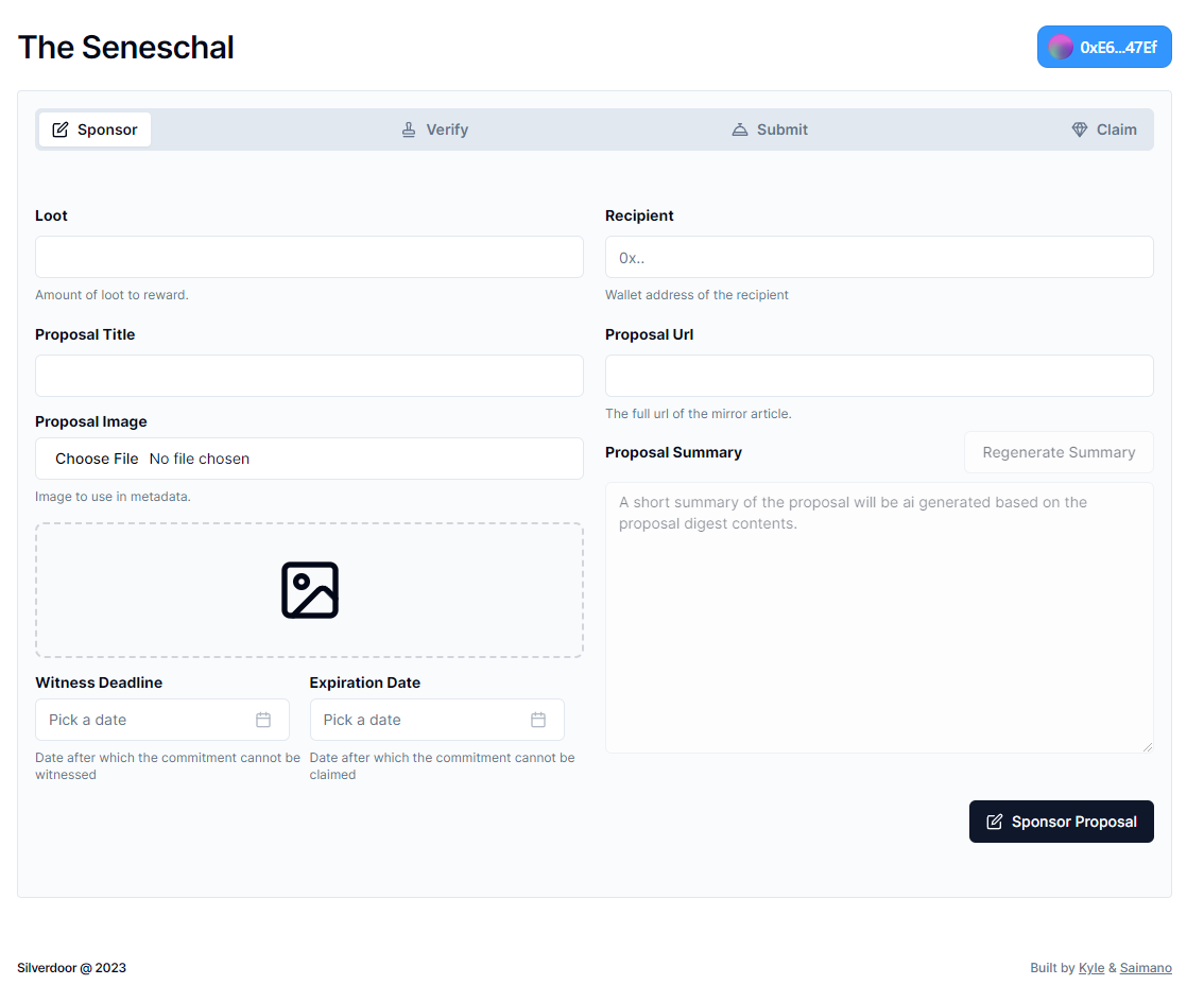 npx create-seneschal-app --name <project-name>- Requires the seneschal contracts to be deployed. Can be found here in this repository.