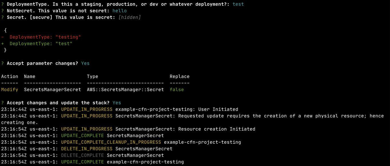 I successfully create a stack with this template, and updated it. During update, I changed a parameter and got the expected JSON formatted diff to accept parameter changes: |