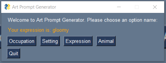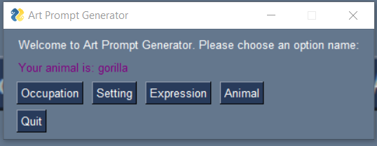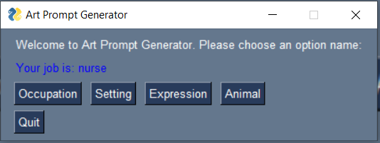 #Hello! You are looking at the code for the second version of Art Prompt Generator! This started out as a text-based tool, but I wanted to add a GUI, and so, using PySimpleGUI, I was able to recreate the text-based tool with one that has a window with functional buttons that you can press as many times as you want to get different prompts!