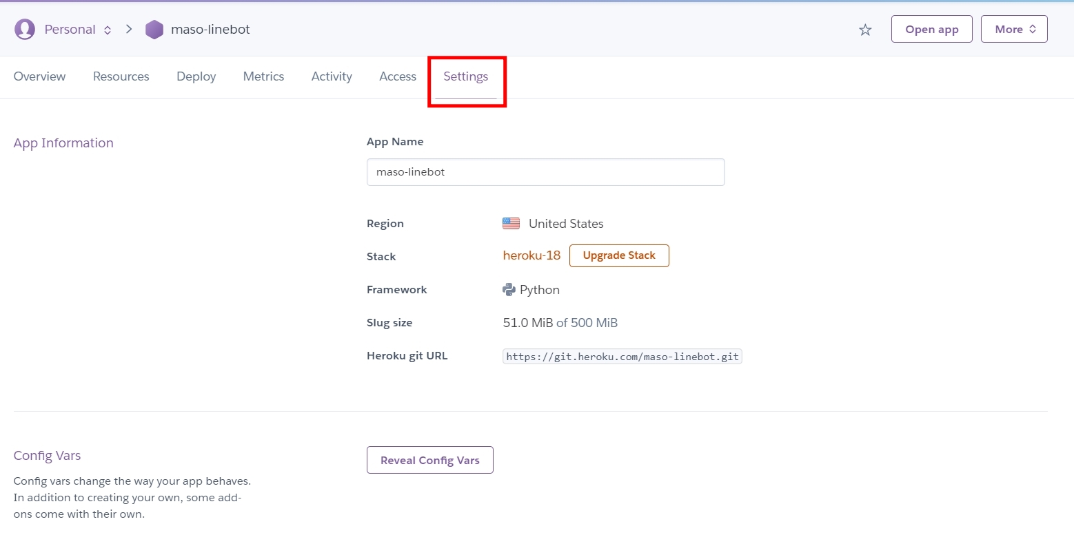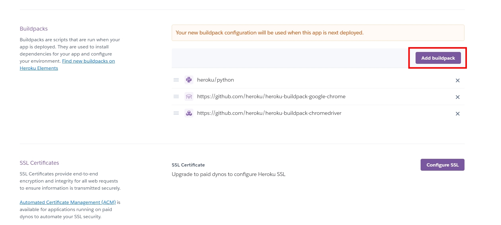2.在heroku設定chromedirver安裝環境,進入APP頁面後,從Settings中點選Add bulidpack,新增以下URL,在Heroku環境中安裝Google Chrome與ChromeDriver。設定完畢後將在下次程式部署Heroku時安裝,會使部署時間與變長,占用容量也會提高,因此會建議先在本機中以selenium爬蟲進行單元測試,確認效果後來再移植到LINEBOT上面。