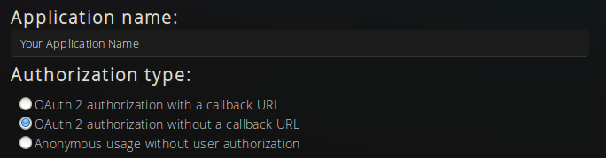 You need to choose a name for your application (e.g. My Forum), and select OAuth 2 authorization without a callback URL (as shown below).