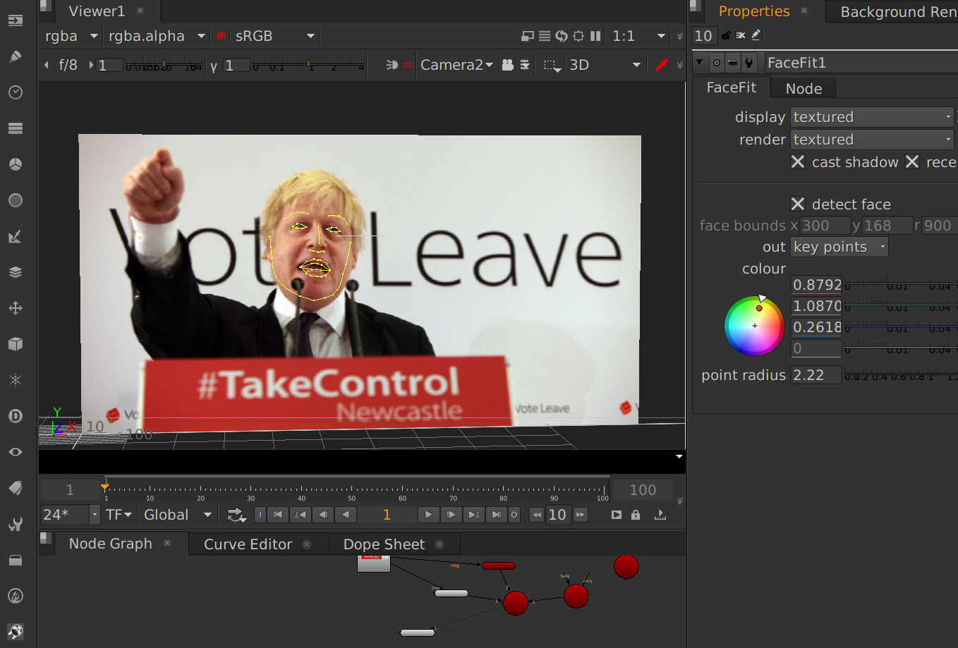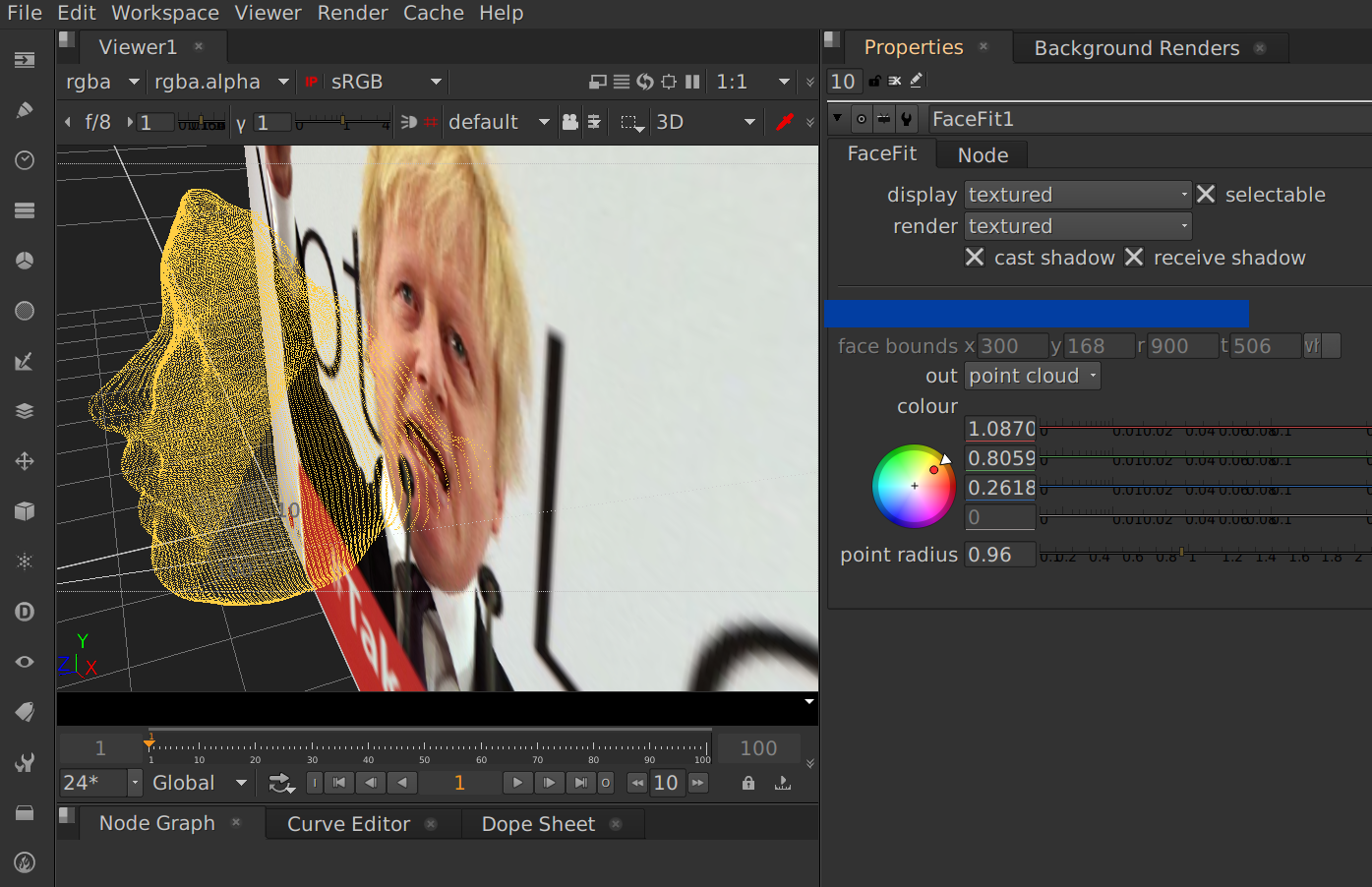It creates a geometry of a face from a single image. I use C++ TensorFlow API for evaluating the model and Dlib for basic image processing for moving data back and forth between TensorFlow and Nuke.