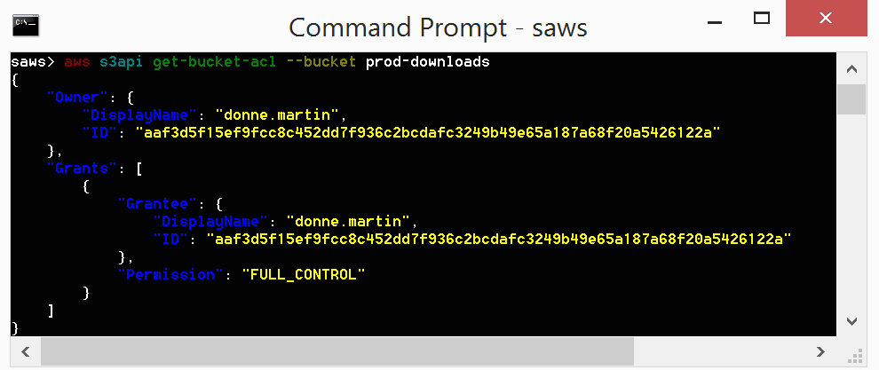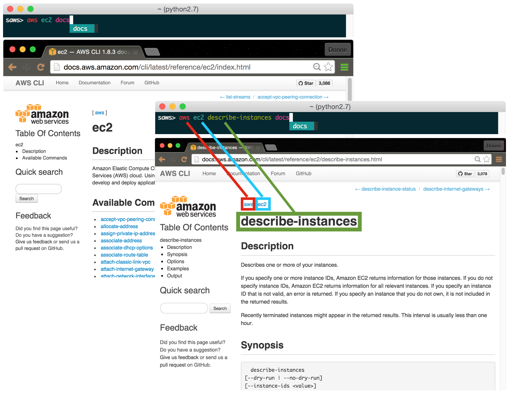 In addition to the default commands, subcommands, and options the AWS CLI provides, SAWS supports auto-completion of your AWS resources. Currently, bucket names, instance ids, and instance tags are included, with additional support for more resources under development.