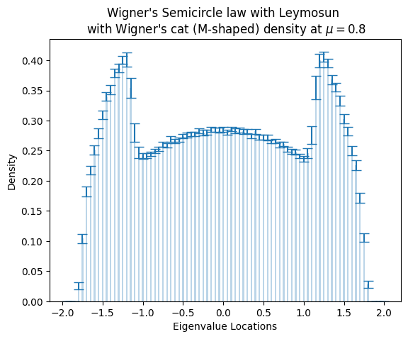 Figure Empirical spectral density for mixed ensemble at$\mu=0.8$ , so calledWigner's Catswith error bars. (See the lecture.) This is also known asWigner Cat Phases, see video. suzen25.