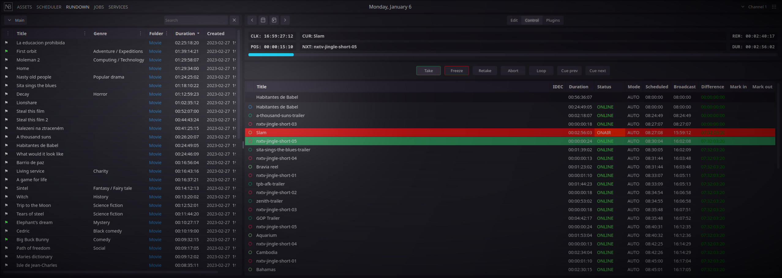 For linear broadcasting, Nebula can control CasparCG or another playout server (using a custom plugin). Broadcasting can run autonomously with and option of starting blocks at a specified time.