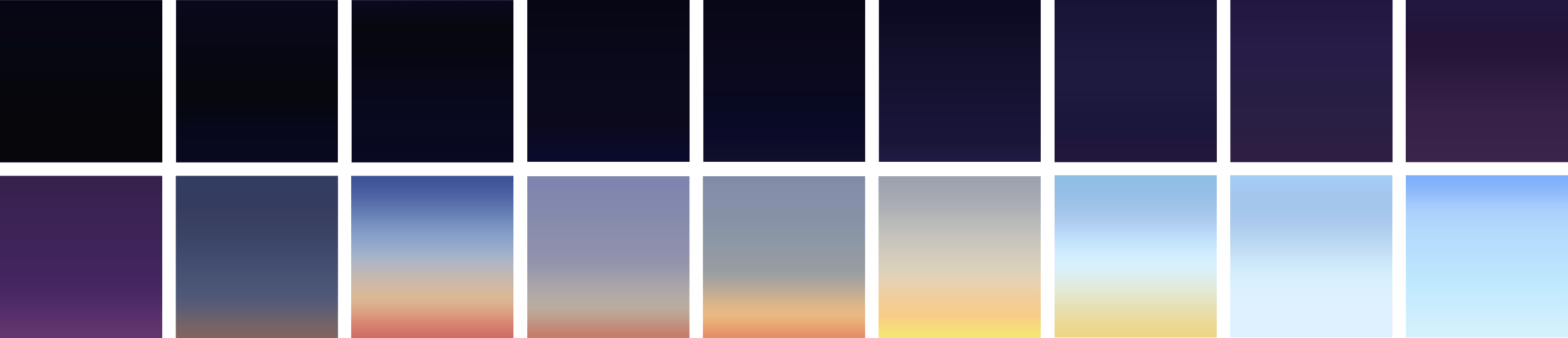 I watched a lot of sunrise- and sunset timelapses to get a feeling for the colorchanges. For every twilight subcategory I abstracted 3 different keyframes out of a frame.