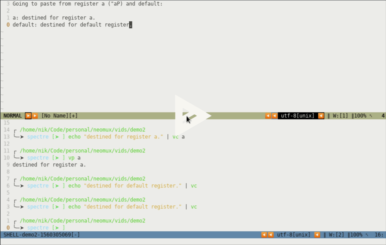 Neomux comes with two helpers for working with vim's registers to copy and paste