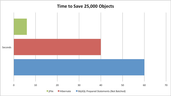 25,000 fake objects were created. Each object has a Customer, Contact (One-to-one) and 4 Producs (One-to-many). All these objects were saved using simple MySQL preppared statements, Hibernate, and jPile. The results were as follows: