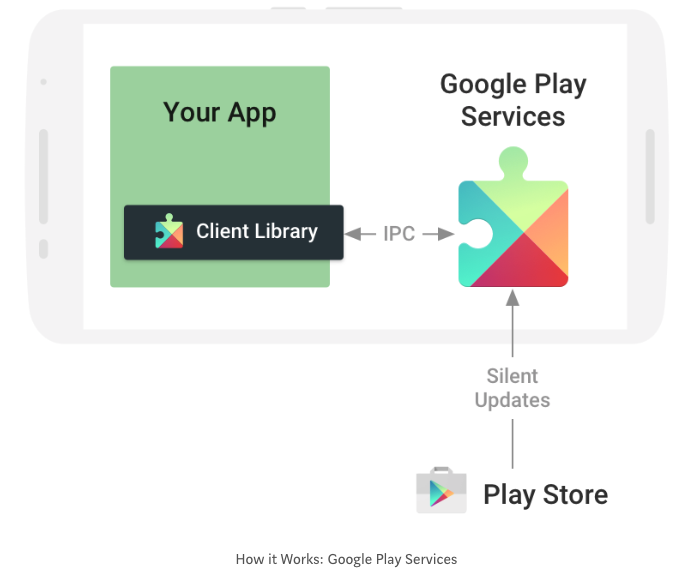 所有 Google 的服務都會經過手機內的 Google Play Services 來傳輸資料。我們可以從下圖得知應用程式是只要使用到 Google 的服務都會透過 IPC 與 Google Play Services 做溝通的(認證、取得資訊...)