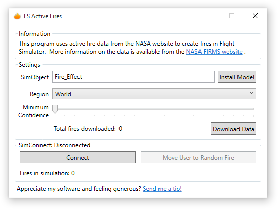 Select a region and adjust the minimum confidence slider, then download data at your discretion. Once Flight Simulator is running, click the Connect button. Fires should appear as you approach them. Alternatively, you can optionally click Move User to Random Fires to move your aircraft to 3000 feet MSL above a random fire.