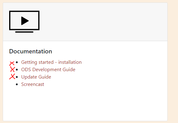 Hi, In case you didn't notice, the following three links in https://www.opendevstack.org/ are broken (page not found): - [Getting started - installation](https://www.opendevstack.org/ods-documentation/opendevstack/latest/administration/installation.html) - [ODS Development Guide](https://www.opendevstack.org/ods-documentation/opendevstack/latest/contributing/development.html) - [Update Guide](https://www.opendevstack.org/ods-documentation/opendevstack/latest/administration/update.html)