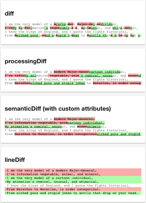 };editCost is specific to processingDiff and controls the tolerence for hunk separation. attrs can contain any/all/none of the following: insert, delete, and equal where the properties in those objects represent attributes that get added to the tags.