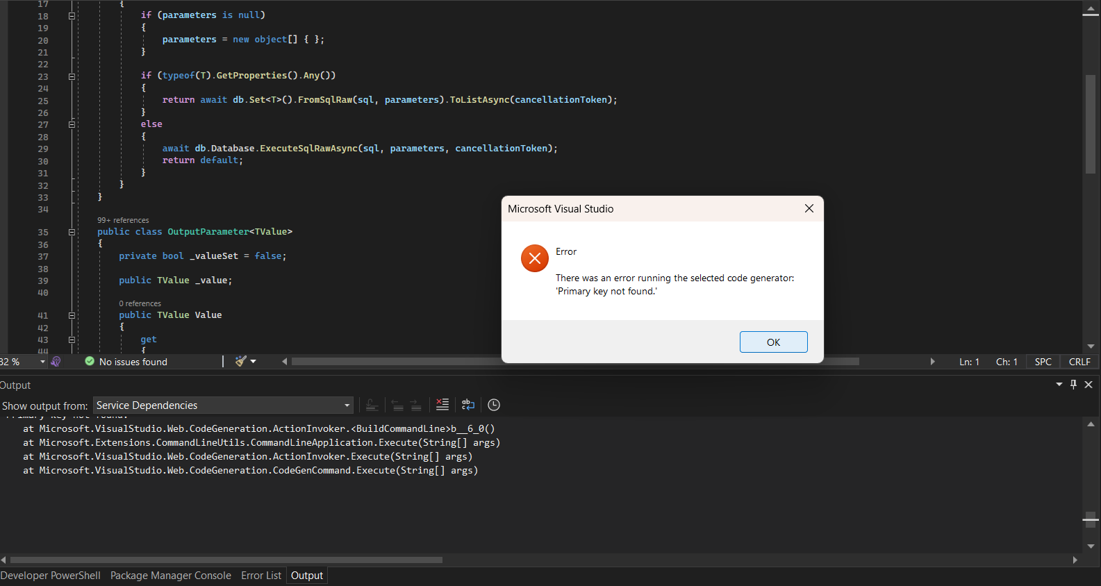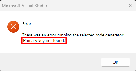 step 5=>Click "Add" Button & it start scaffolding the code & it shows the error "Primary Key not found" even it have a primary key in its model.