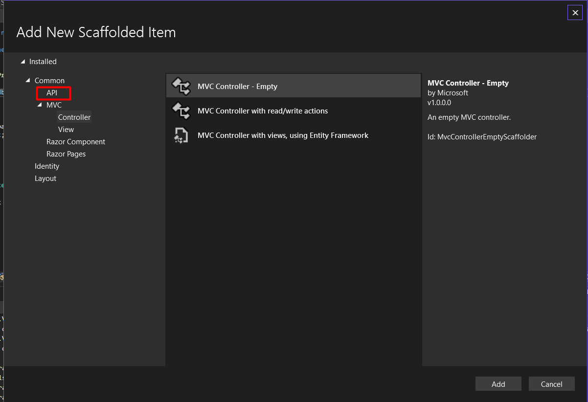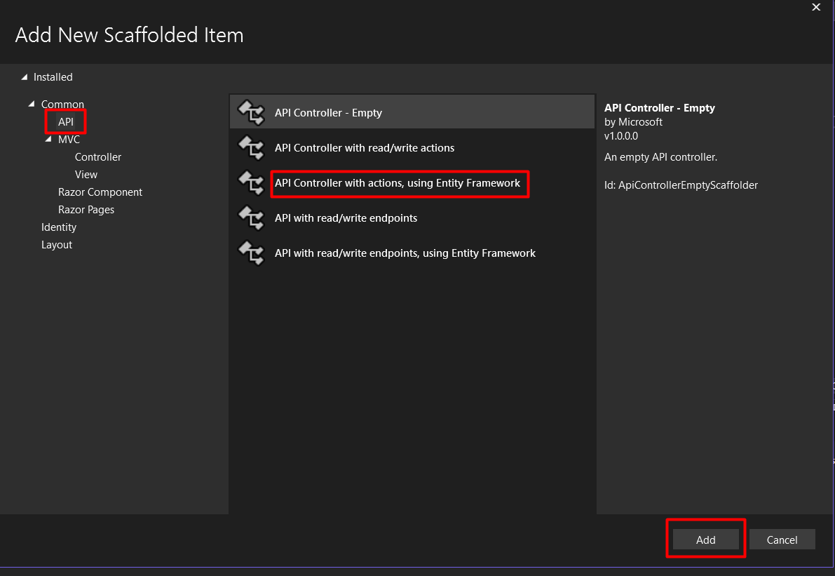 step 1=>After completing "Reverse Engineer" process in EF core power tool, "Right click" the controller to add a new controller.