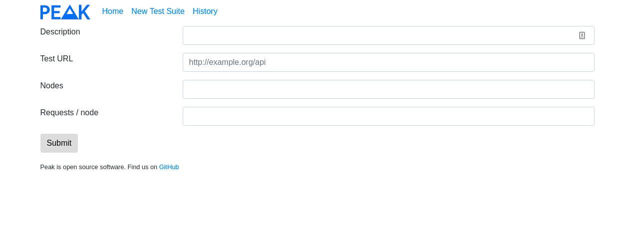 peakweb provides the front-end web interface for peak API performance testing. From here, users can create new test suites, and view the results of previous tests.