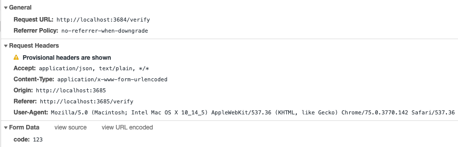 Request on '/verify' with wrong verification code doesn't return error or any status, it just fails.