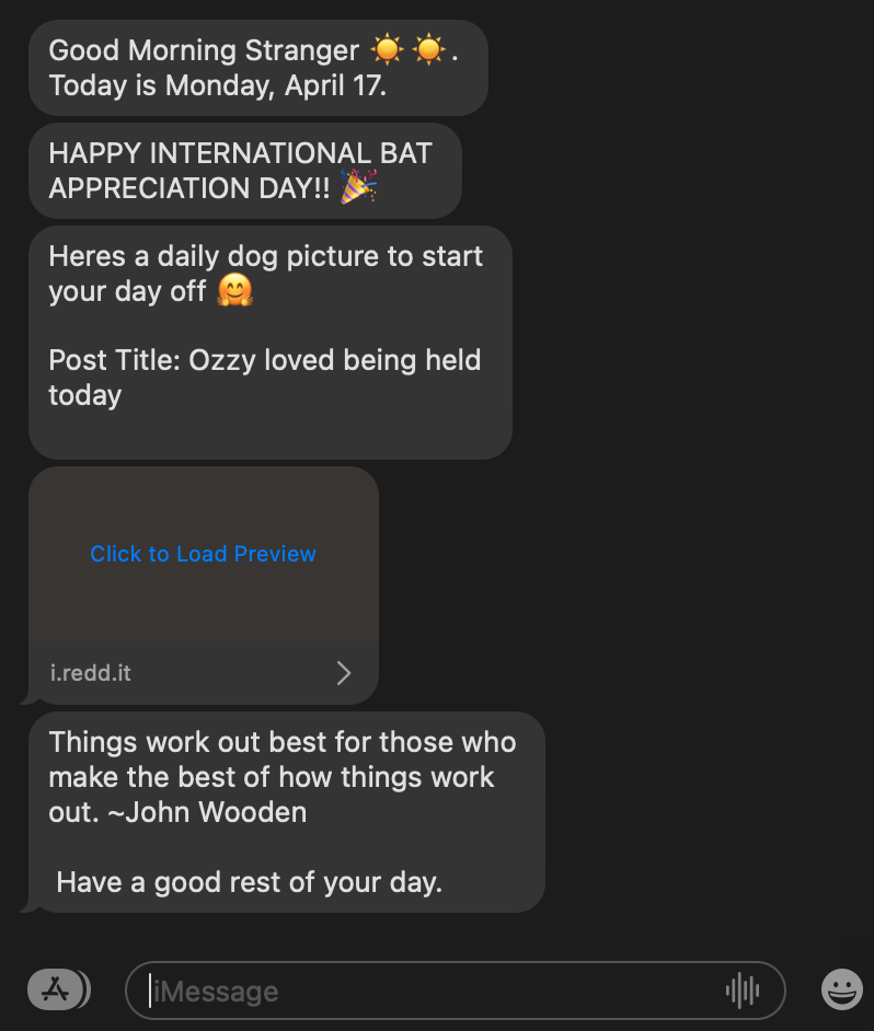 A customizable automated bot that sends personalized morning messages through iMessage, featuring daily rain updates, NBA schedules, and more.