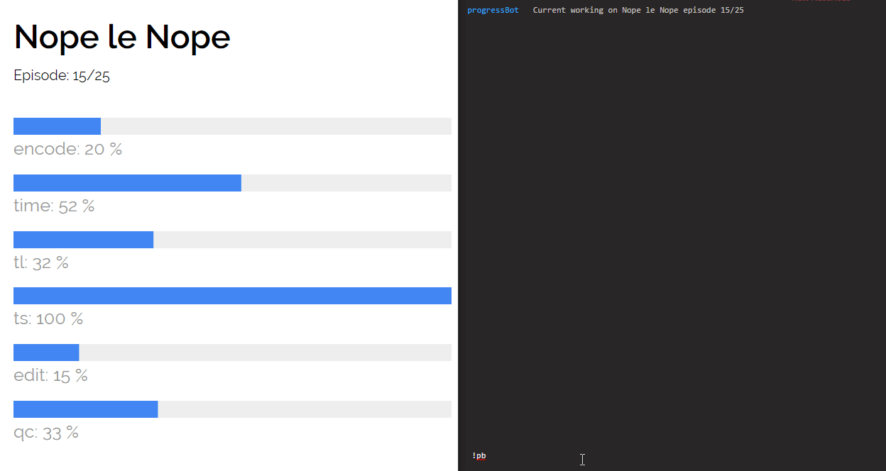 High-tech weaponized moe progress delivery bot for IRC, Discord, and web. Uses NodeJS and socket.io to update progress from IRC/Discord messages onto a web interface. The web interface can also be embedded on another page to provide instant and live progress updates.