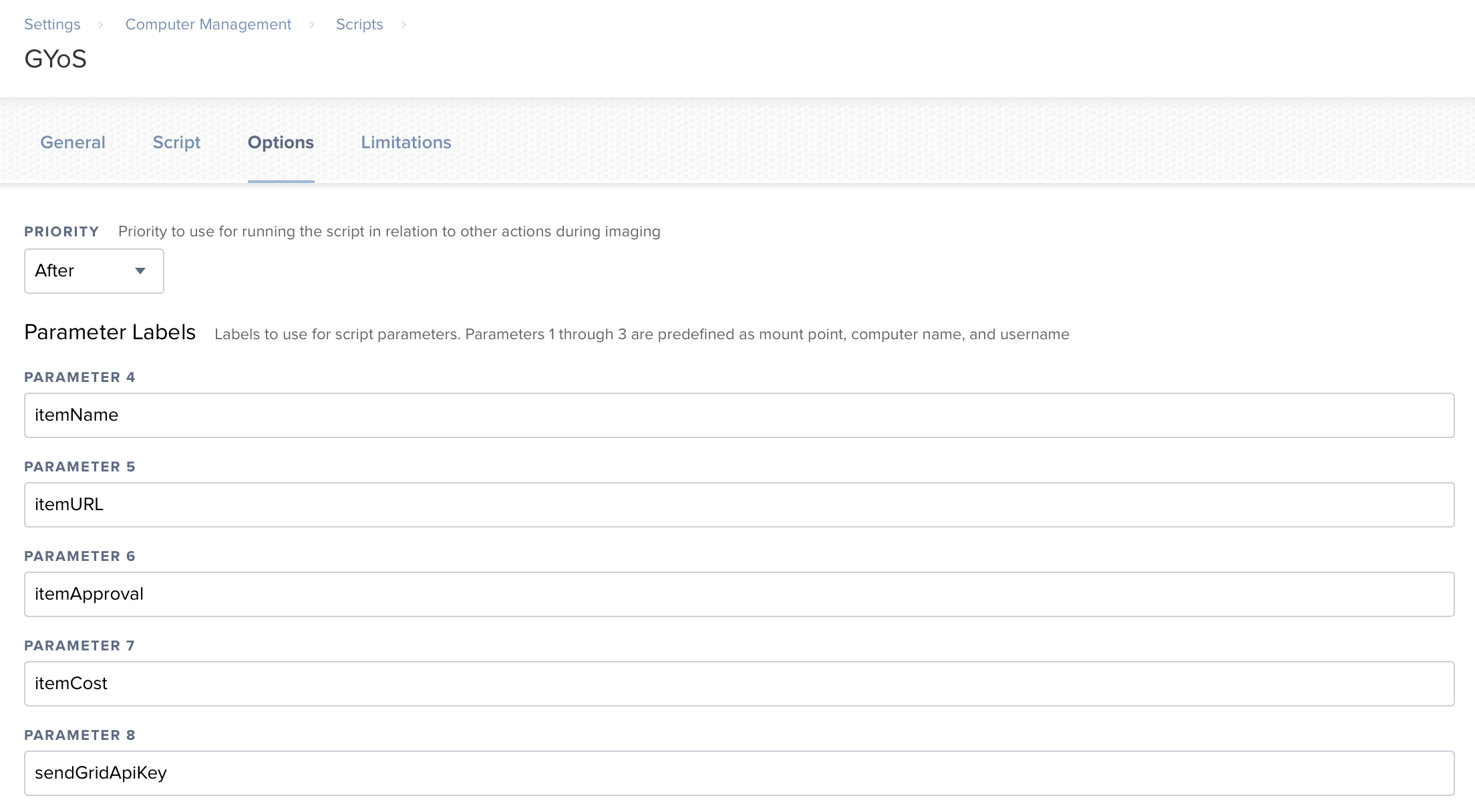 • Create Script Options for the Script in Jamf Mapped to these Script Parameters.