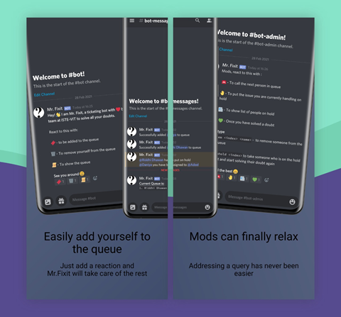 Mr. Fixit is an interactive ticketing discord bot which helps the user to get their query solved by assigning themselves into the queue, on the other hand Mrs. Jazzy is a discord music bot.