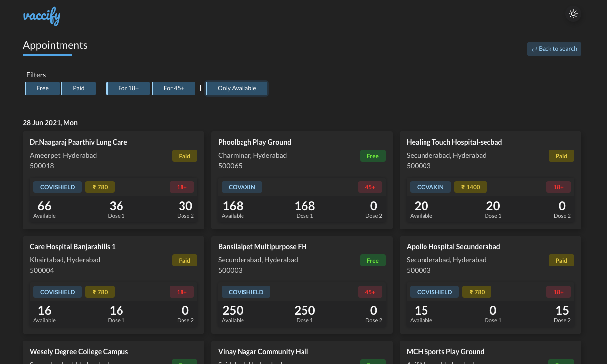 - This application uses Co-WIN Public APIs as its source of vaccination appointment availability data. Hence it is not responsible for any discrepancy or incorrect/outdated information shown to the user.