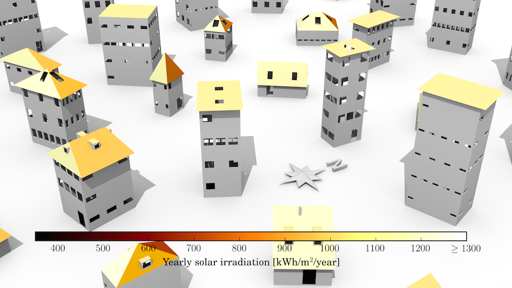 The estimation of the solar irradiation of roof surfaces is one of the prominent use-cases of 3D city models. This use-case is important for estimating the feasibility of installing a photovoltaic panel on a roof. Such estimations are usually done on a large-scale, e.g. on the area of a municipality. For instance, see an example in Germany. Further, there are many academic articles that explore this topic.