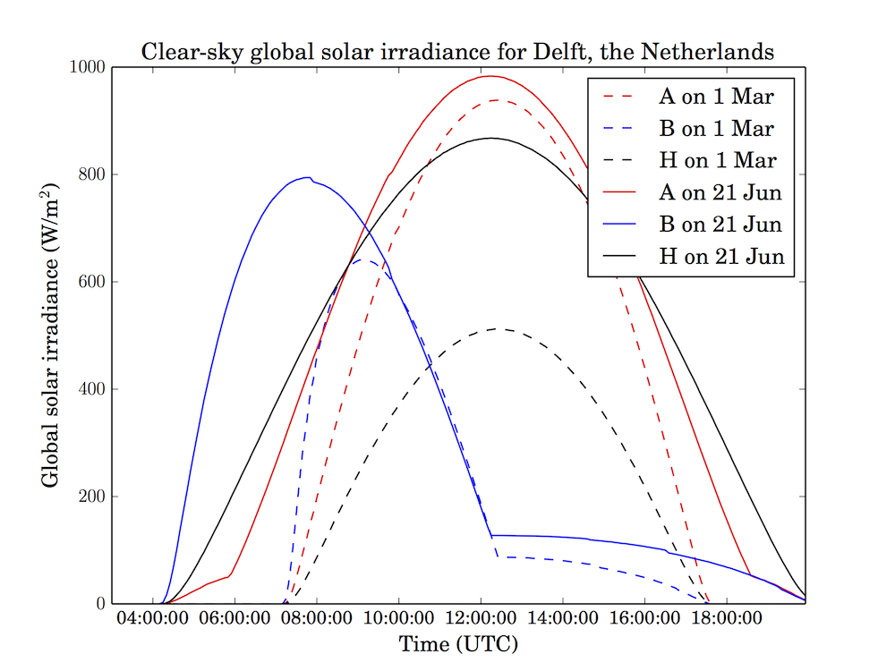 This is not really a part of the utility, but might be helpful to understand how the estimation of the solar irradiation works. The script dailyplot.py plots the global solar irradiance on a tilted and oriented surface at a location on a specific date. Multiple locations, multiple surfaces, and multiple dates are possible in order to compare the settings.
