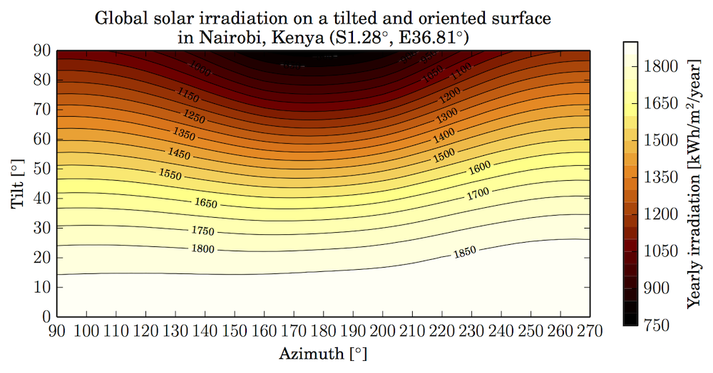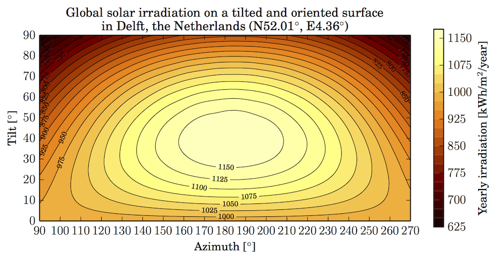 The solar radiation differs depending on the tilt and orientation of a surface. The plot below show that TOF (tilt-orientation-factors) for Delft in the Netherlands. It is visible that the difference between the irradiation on differently tilted and oriented surfaces is significant.