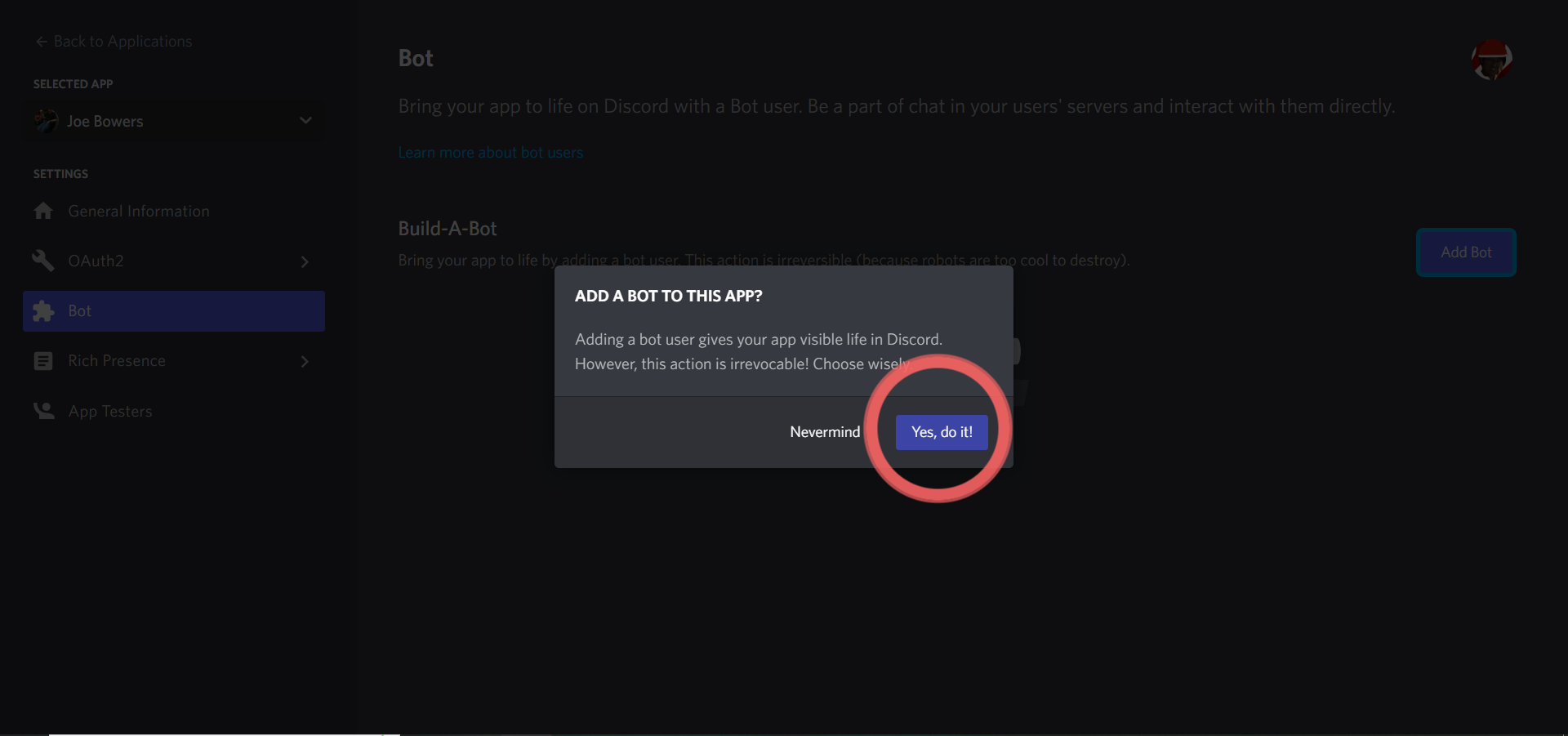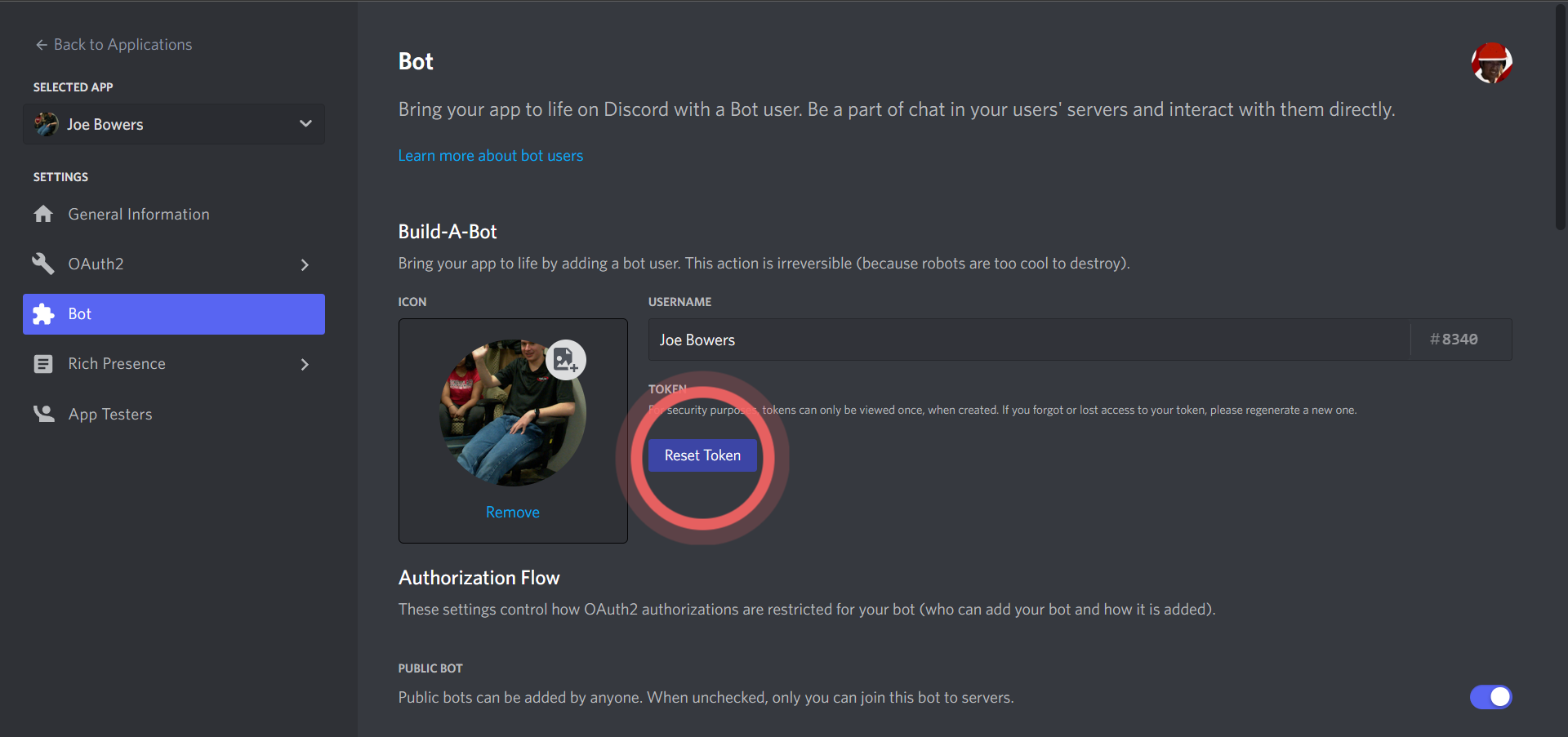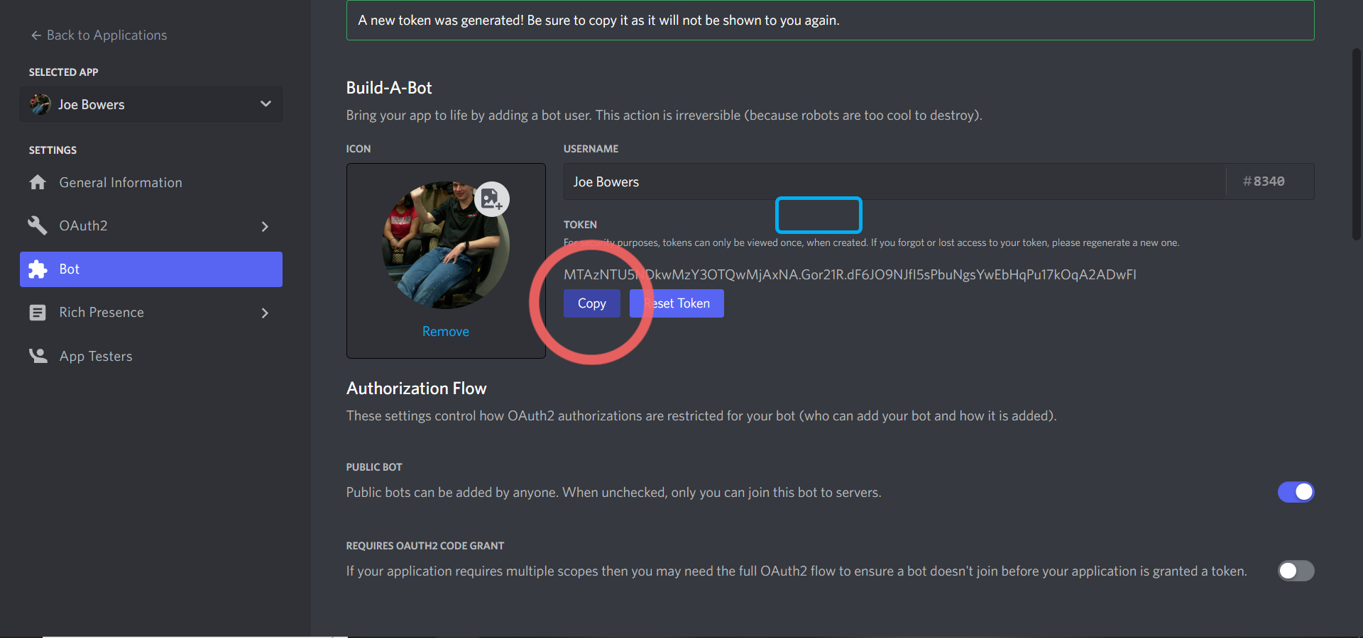 Over on the left, click on "Bot", then over on the right, click "Add Bot", it will prompt you, click "Yes, do it!". Then click on "Reset Token" and copy it. Go to the .env file of the root directory and type in "TOKEN=" and paste in the token that you copied.