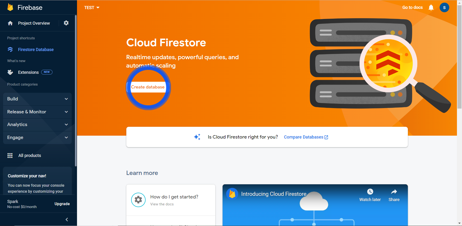 Over on the left is a "Build" dropdown. Click on it and then click on the "Firestore Database".