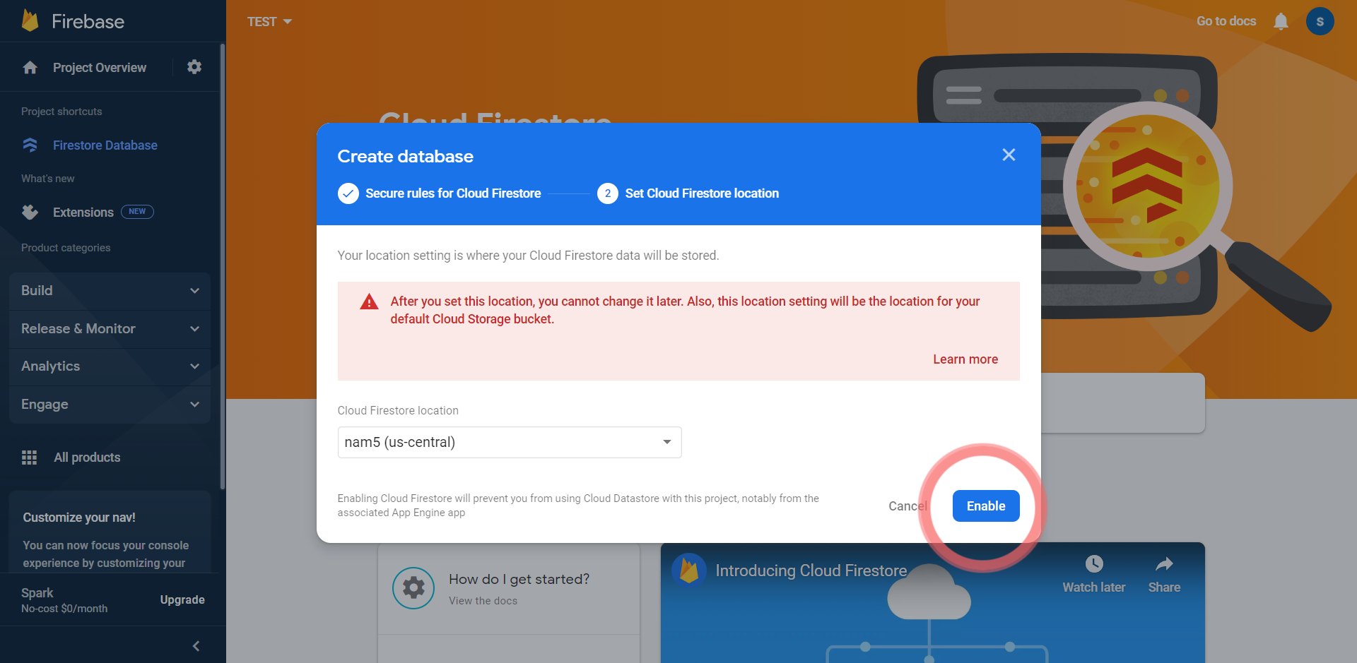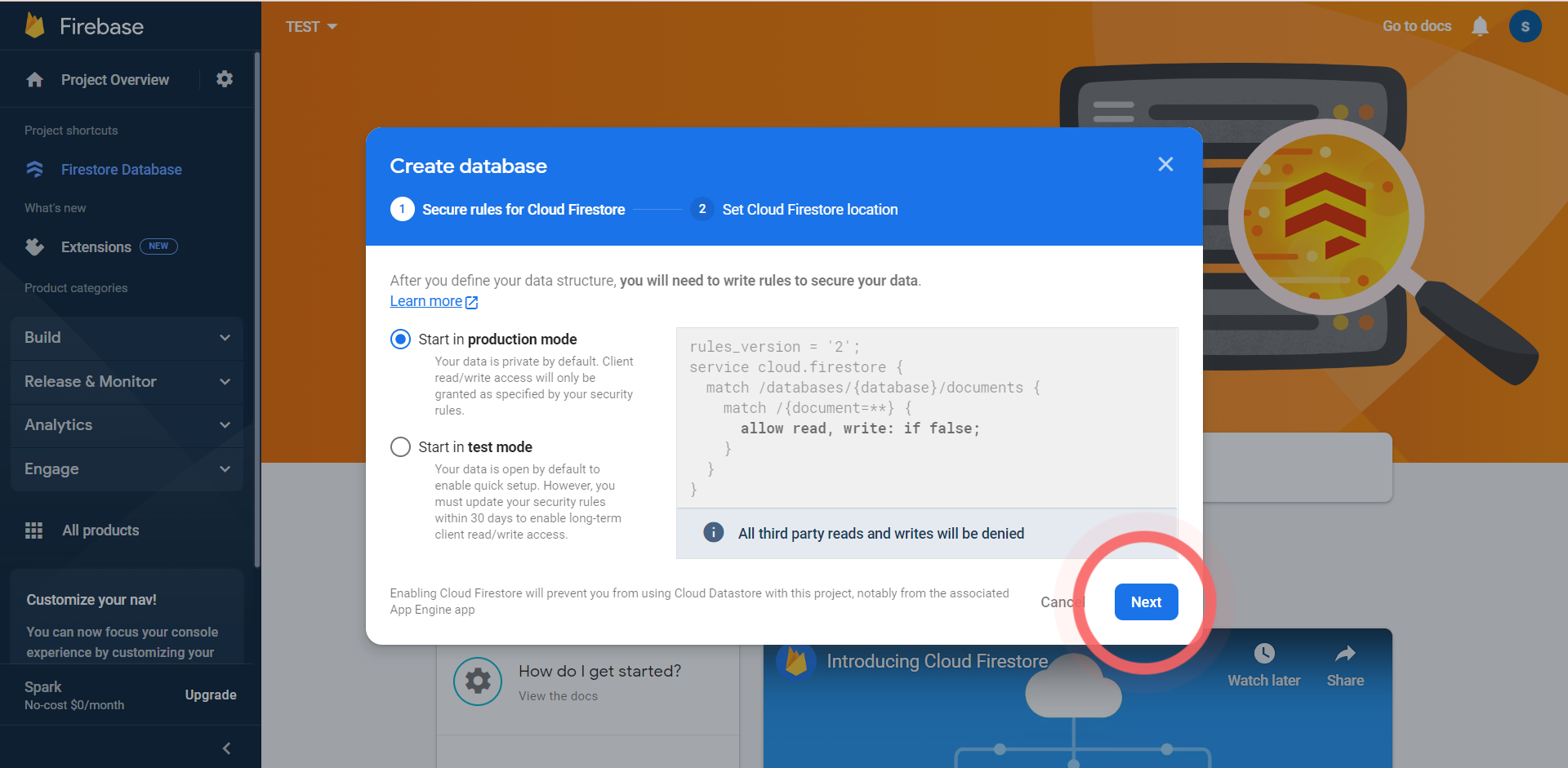 After it finishes setting up, you've now setup a firestore database! Now we need to click on the cog wheel at the top left right next to "Project Overview" and click on "Project Settings".