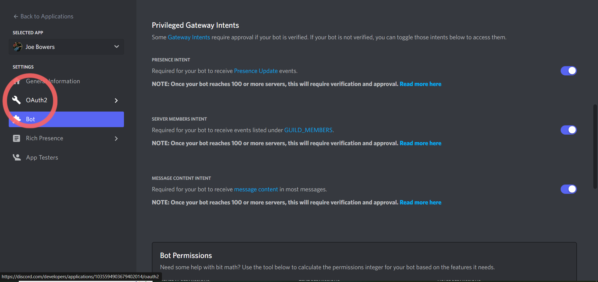 Scroll down to "Privileged Gateway Intents" and turn on "Presence Intent", "Server Members Intent", and "Message Content Intent". Make sure to save the changes.