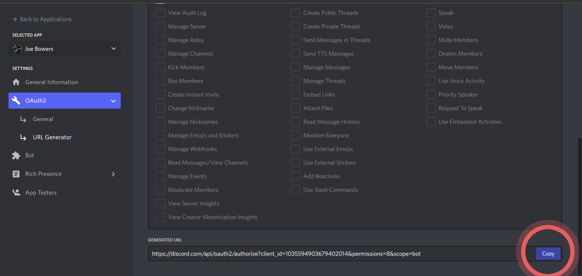 Going back to the left, click on OAuth2 and then URL Generator underneath it. Under scopes, check on "bot", scroll a bit down to "Bot permissions", and check on "Administrator".