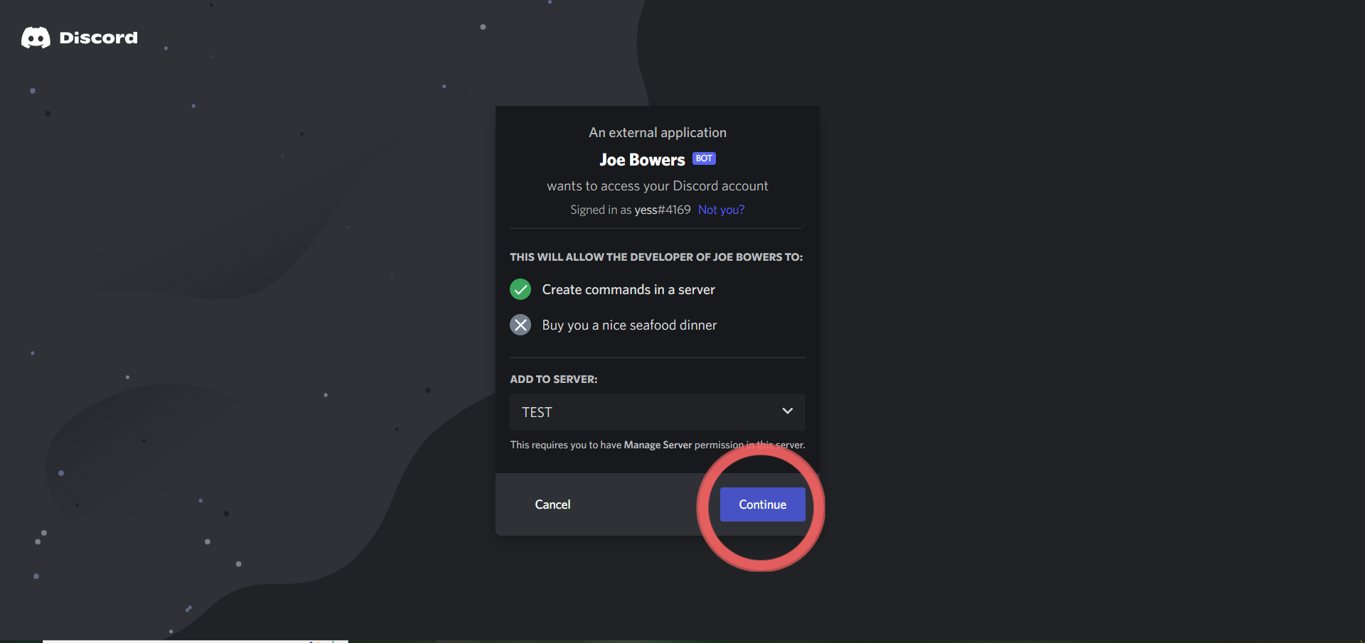Now copy the generated URL all the way at the bottom and paste it into the search bar. This will prompt an invite for the bot to a server where you can invite the bot. Make sure to invite it to a server where you can test it. Once you've invited it, you've finished this step!