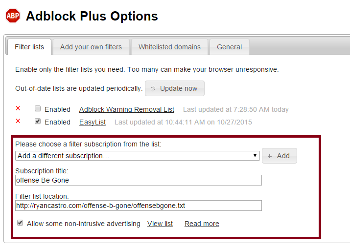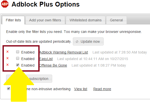 - If you're a good netizen who wants to block only offensive ads, disable the other default lists.
