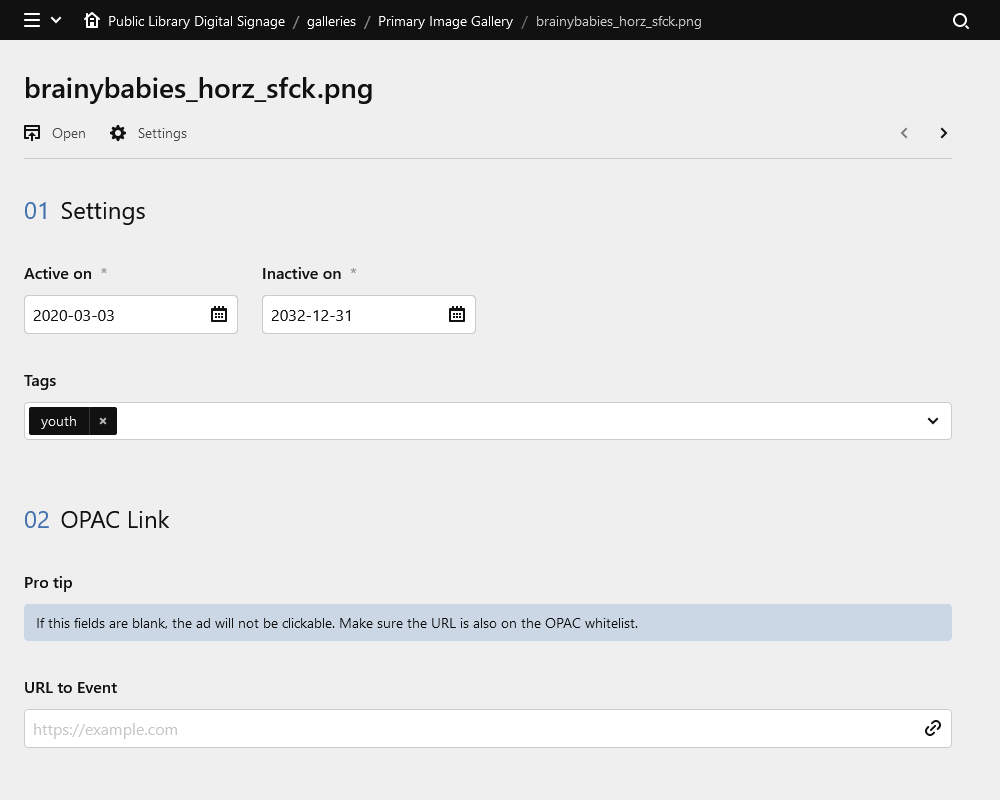 once in the panel, You can either manually reconfigure the slide content files and re-integrate them, but there's enough changes from prior versions I recommend re-uploading the slide images and re-assigning their start/expire and tags by hand to prevent issues. Video and image content now live in the same folder, image orientation can still be determined automatically, but video content still needs the orientation tag set manually, but since they share a folder both types of content share the field.