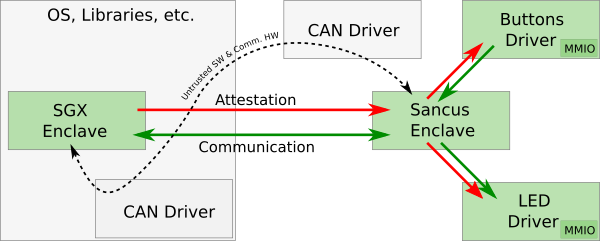 Participants of this tutorial will develop a distributed trusted computing application that features secure, authenticated communication between an embedded MSP430 Sancus enclave and an off-the-shelf x86 Intel SGX enclave. Particularly, as depicted below, the application's goal is to cryptographically prove to a trusted SGX enclave that an expected Sancus enclave is executing untampered on a genuine Sancus-enabled CPU (i.e., remote attestation guarantee). The Sancus enclave itself will furthermore establish local trust relations with dedicated Sancus driver enclaves for secure I/O (i.e., local attestation guarantee). All communication between the SGX and Sancus sides proceeds over an untrusted automotive industry-standard CAN bus.