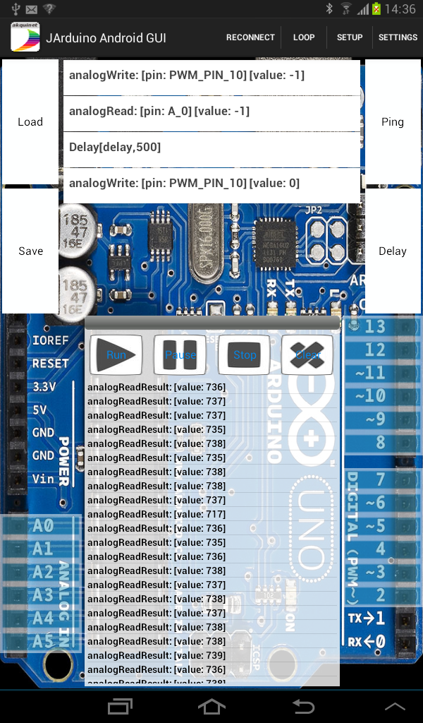 If you click the button Run (Play), the orders of the setup list will be executed once, and the loop list orders will be executed infinitely. Pause: pauses the execution of the orders. If play is pressed while it is paused, it will continue. Stop: stops the execution. Clear: clear the two lists (loop and setup). Delay: a pop-up will be open to set the delay you wish. Save: save the two lists into the specified file. Load: load the two lists contained into the specified file. Ping: send a ping to the Arduino.