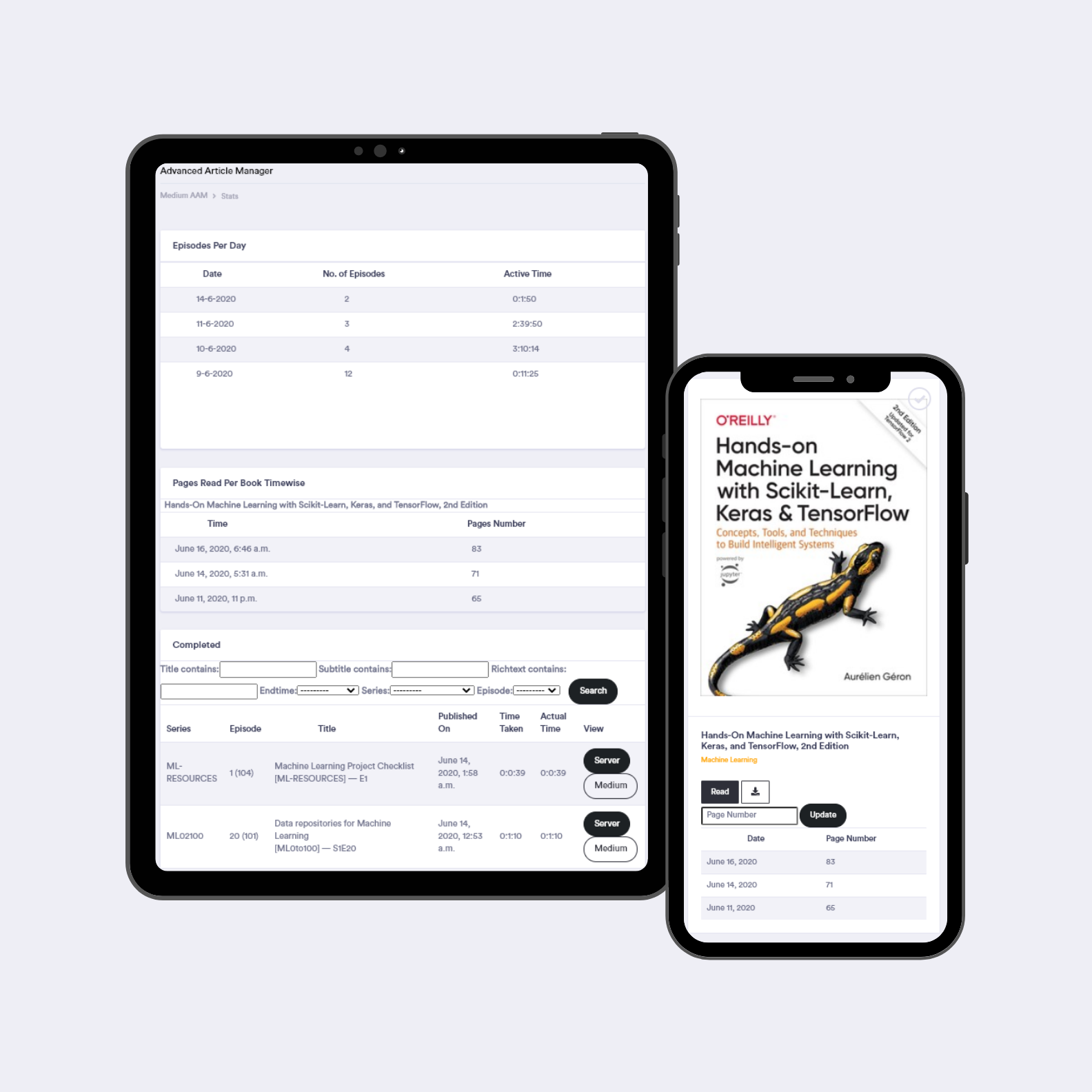 Get various statistics like episodes and the total time spend per day, pages read book-wise, etc.