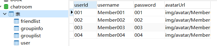 导入mysql数据库文件(chatroom.sql),保存了用户的信息,用来登录
