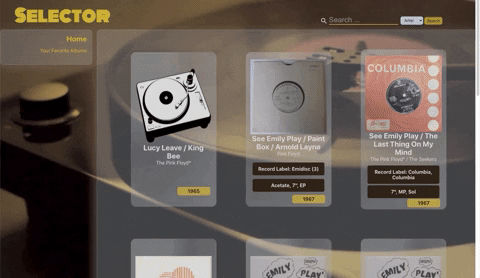 Selector is a web application that seamlessly connects your Discogs vinyl purchasing experience with the convenient streaming capabilities of Spotify. Users can discover, browse, save, and sample their (soon-to-be) favorite music. This Cypress-tested, multi-page user-interface was built using React, React Router, JavaScript, HTML, CSS, and ApolloClient; integrated using Travis CI and depolyed on Heroku.