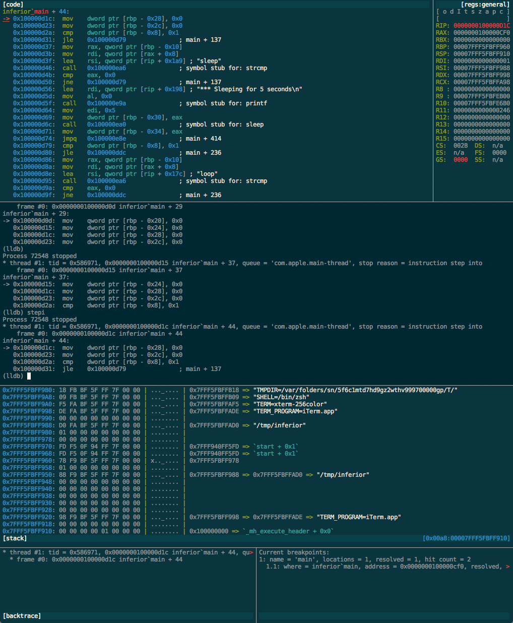 Voltron is an extensible debugger UI for hackers. It allows you to attach utility views running in other terminals to your debugger (LLDB or GDB), displaying helpful information such as disassembly, stack contents, register values, etc, while still giving you the same debugger CLI you're used to. You can still have your pimped out custom prompt, macros, plugins, terminal colour scheme - whatever you're used to - but you get the added bonus of a sweet customisable heads-up display.