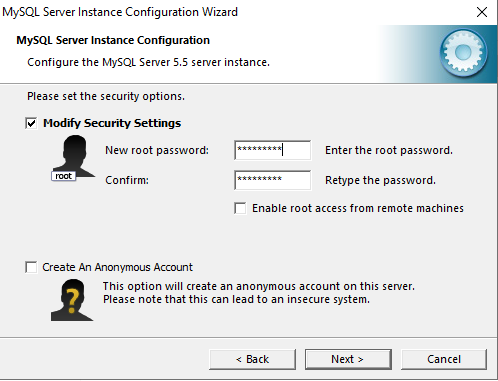 10.) Download and install MySQL 5.5.62 (mysql-5.5.62-win32.msi) Run the setup wizard: Typical Setup -> Launch Configuration Wizard (after install) -> Standard Configuration ->