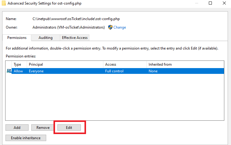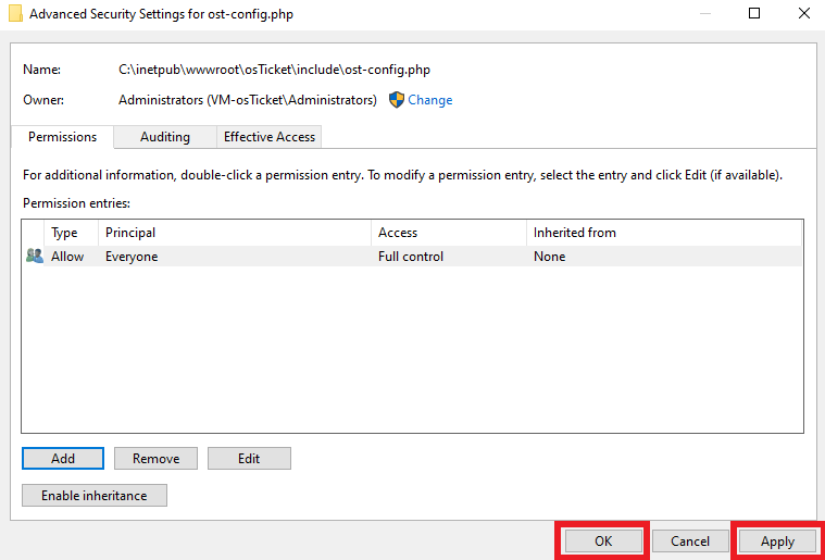 We then will want to set the permissions back to "Read" only in the ost-config.php file.