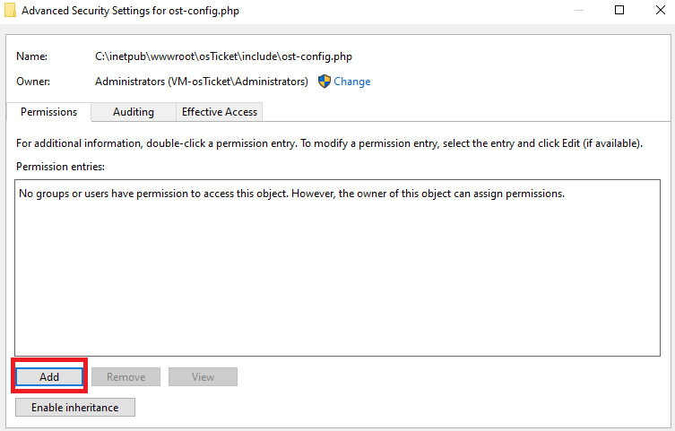 Now that we have renamed the files, right click on the file and go to properties. From there click security, click on advance, and disable the inheritance. We will select Remove all inherited permissions from this object.