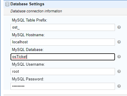Once that is done we will continue to setup osTicket in the browser. Click Continue on the osTicket browser page. Fill out the page as required except the Database Settings at the bottom of the page. We will get to that.