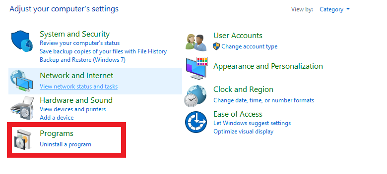3.) Once you have connected to your virtual machine you will want to go to your control panel. From the control panel open up programs. Select, Turn Windows features on and off.