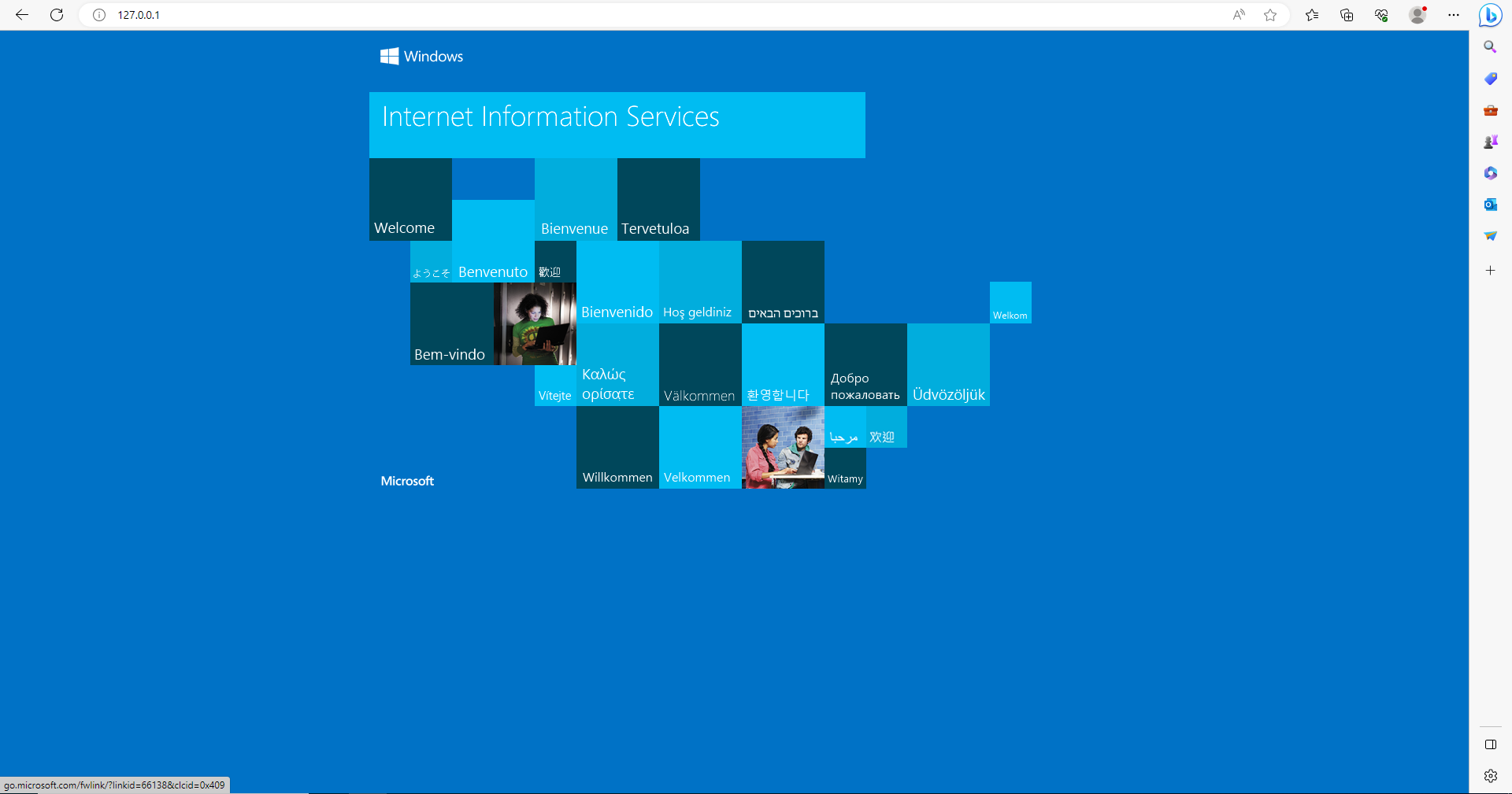 To make sure the IIS is installed / enabled go to a browser of your choice and search for 127.0.0.1 It should look something like this.