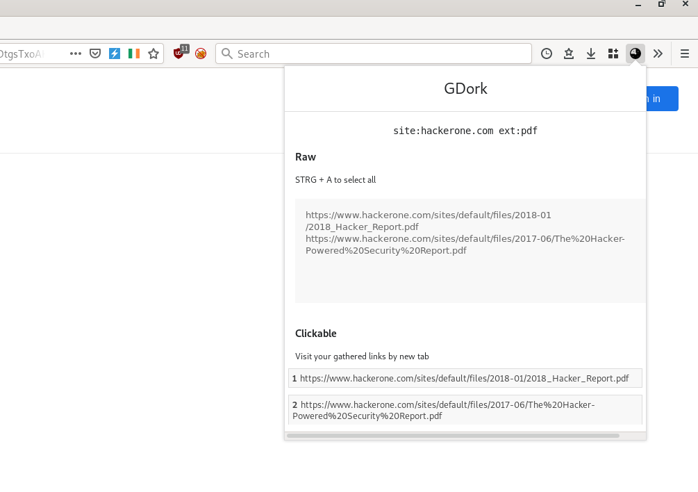 A Mozilla Firefox extension which allows quick access to your google-dorking result