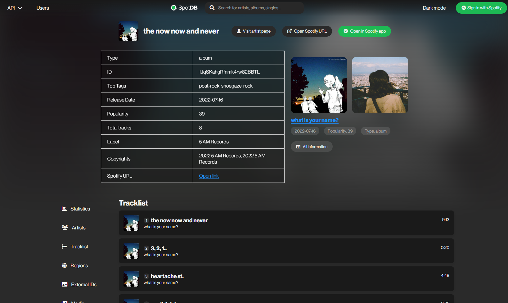 SpotDB is a platform that lets you search for Spotify albums, tracks, artists, playlists (and more, and gather detailed information about what you searched for. SpotDB is a completely open-source platform that uses the official Spotify WebAPI, as well as additional third-party APIs to gather information like track lyrics, writers and more.